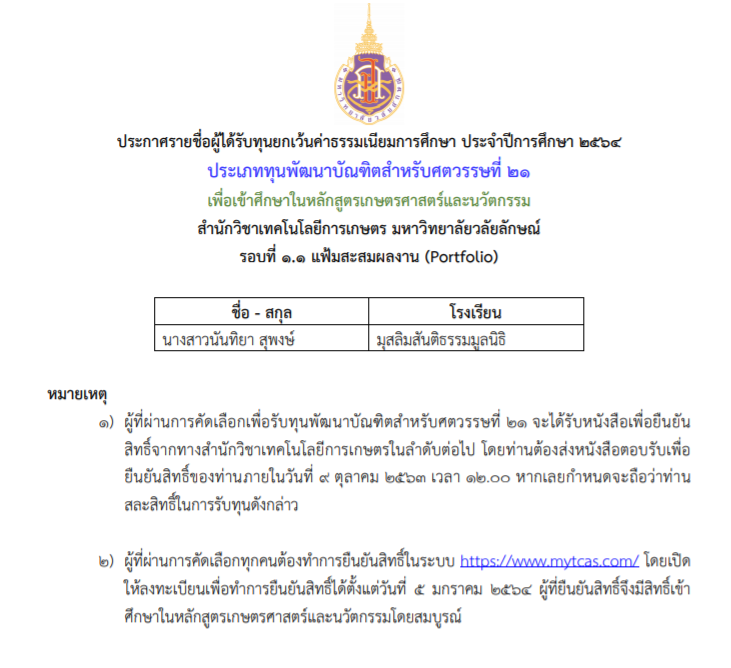 ประกาศรายชื่อผู้ที่ผ่านการคัดเลือกเข้ามาศึกษาต่อในหลักสูตรวิทยาศาสตร์อาหารและนวัตกรรม รอบ TCAS1.1