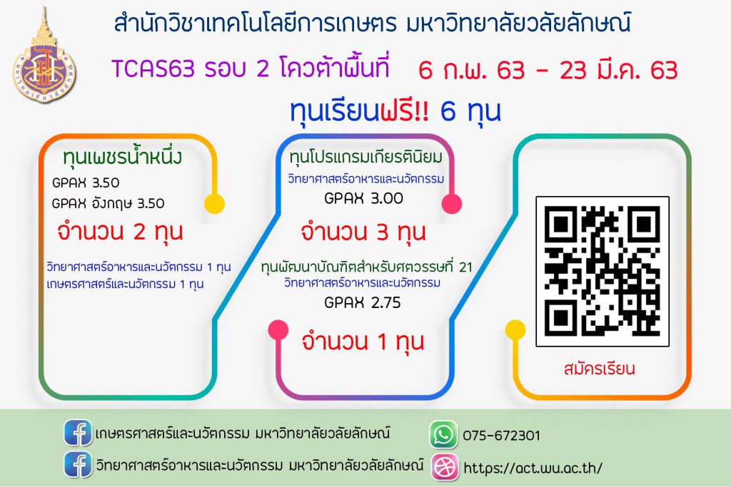 ประกาศรายชื่อผู้ผ่านการคัดเลือก TCAS2 รอบโควต้าพื้นที่ (เพิ่มเติม) สำนักวิชาเทคโนโลยีการเกษตร