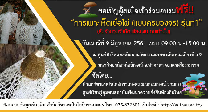 ขอเชิญชวนผู้สนใจเข้าร่วมอบรมฟรี!! “การเพาะเห็ดเยื