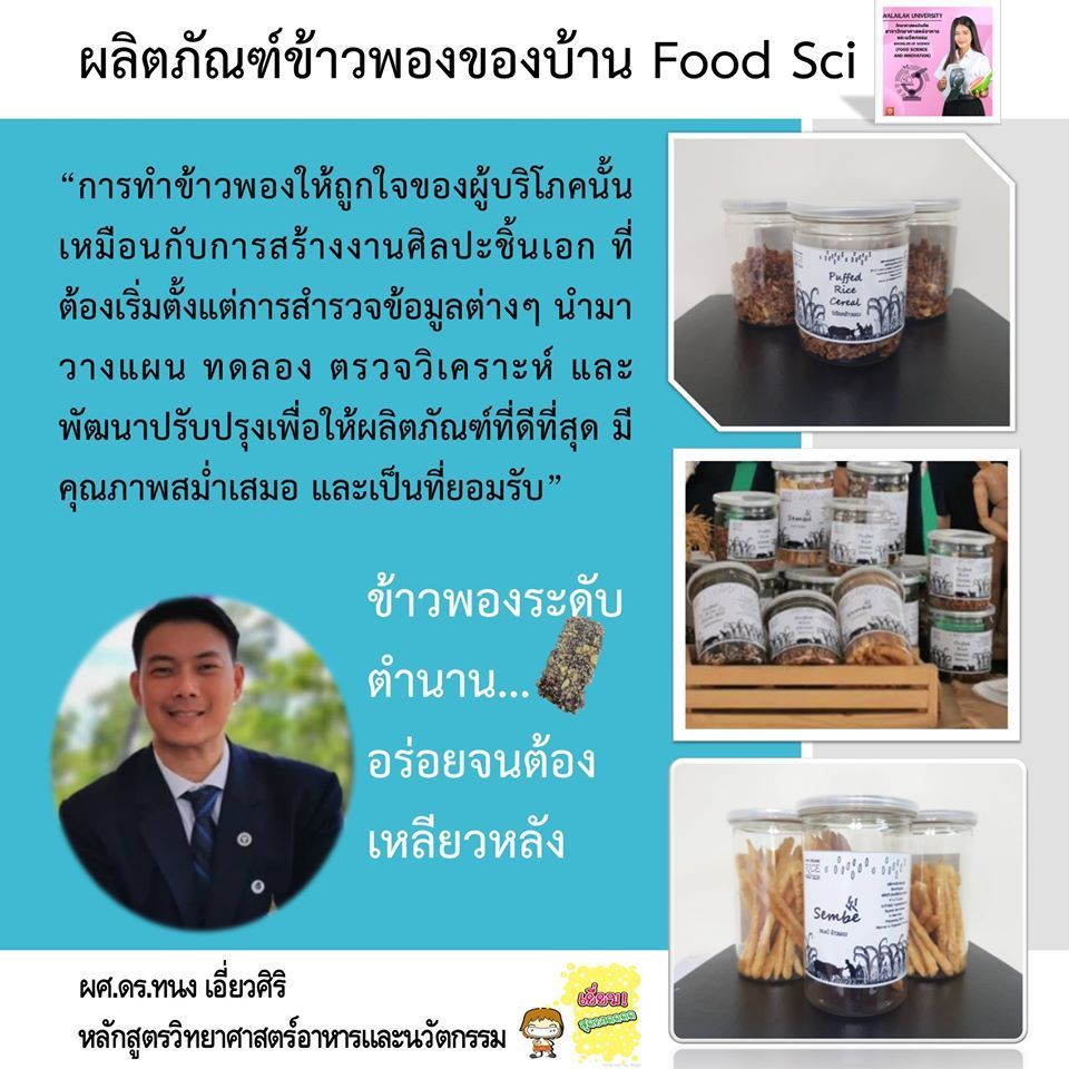 It was invented by the Food Science team to become perfectly healthy food because it has high nutritional value, with the main ingredient of organic brown rice. So Yummy! crispy, tasty, and safe. We also created food with innovation throughout the world. Come to join us! to creating food innovations with Food Science and Innovation Program.