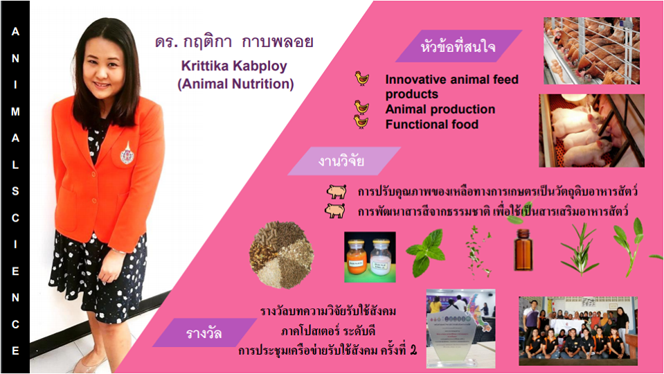 The School of Agricultural Technology enters to 28 Years of prosperity. The Agricultural and Innovation Program is proud to present Dr. Krittika Kaploy from the Animal Science Program and another quality instructor of our institute. Fodder is an important raw material for raising animals yield. The development of animal feed research was carried out by Dr. Krittika Kabploy, which could be used by the local community and to develop production technology to feed animals with the suitable habitat.