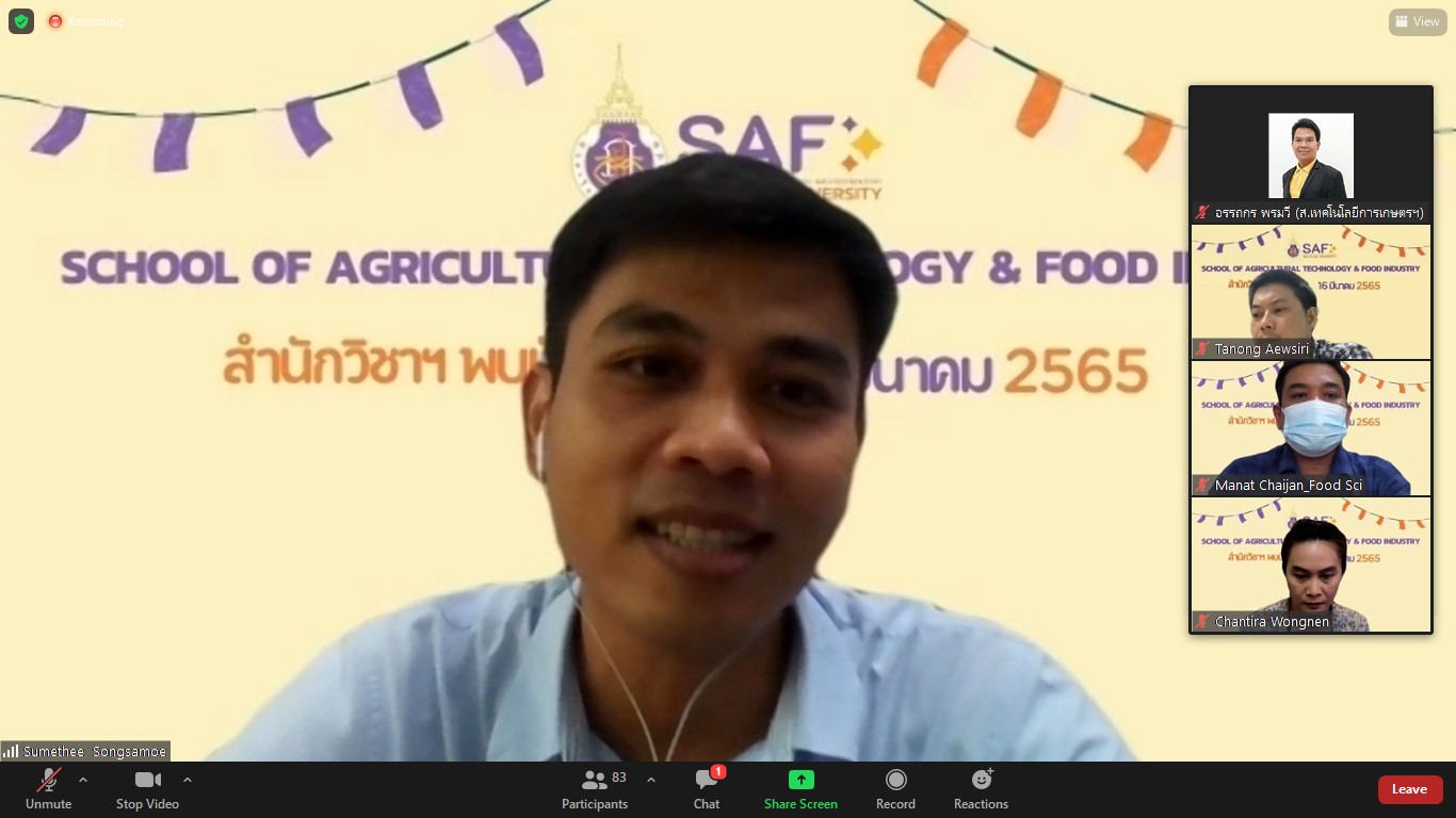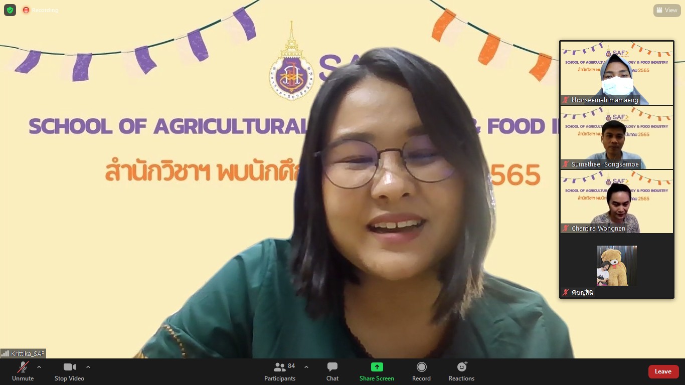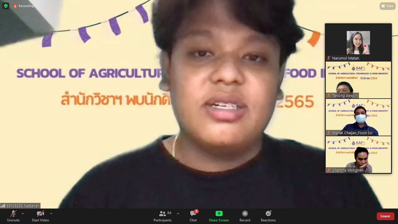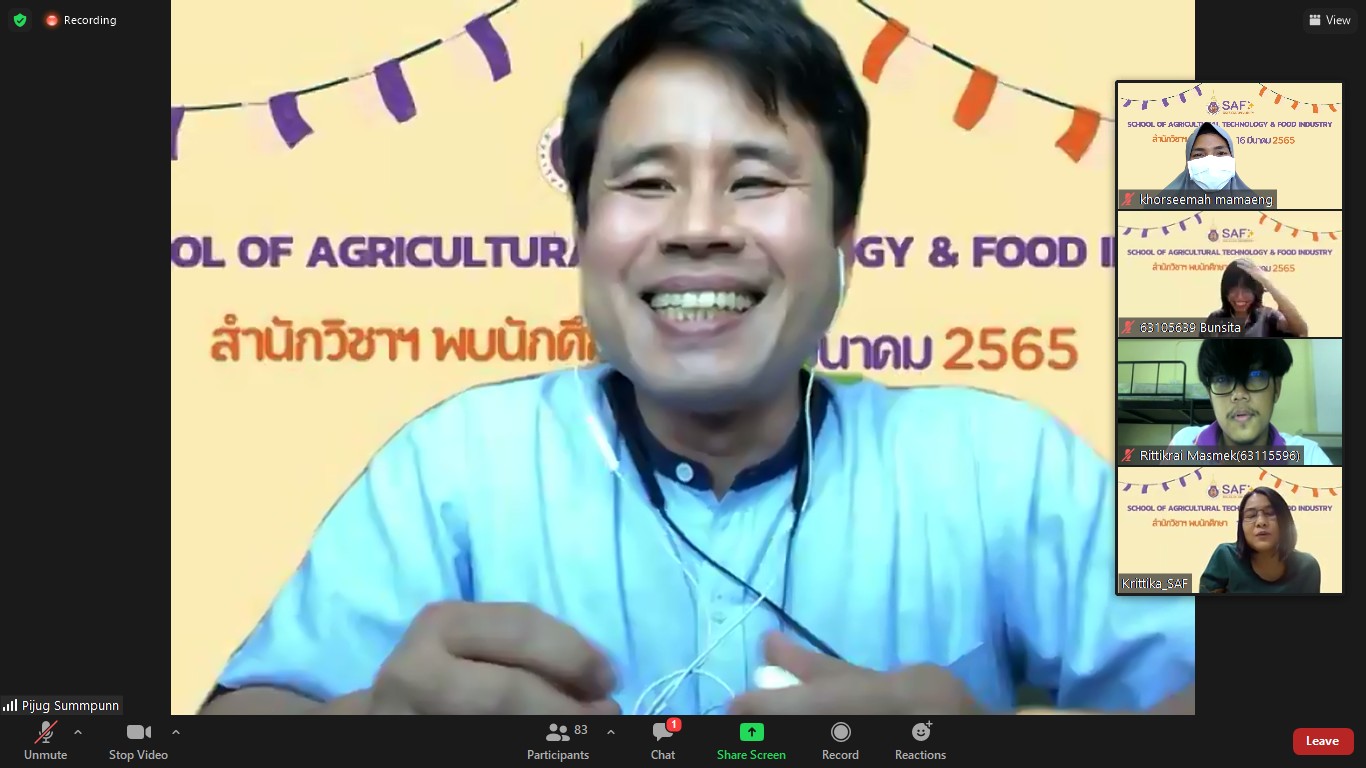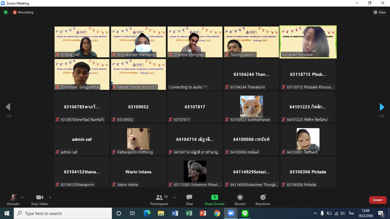 เมื่อวันที่ 16 มีนาคม 2565 สำนักวิชาเทคโนโลยีการเกษตรและอุตสาหกรรมอาหารได้จัดกิจกรรมสำนักวิชาพบนักศึกษา ของภาคการศึกษาที่ 3/2564 ผ่านทางออนไลน์ zoom meeting