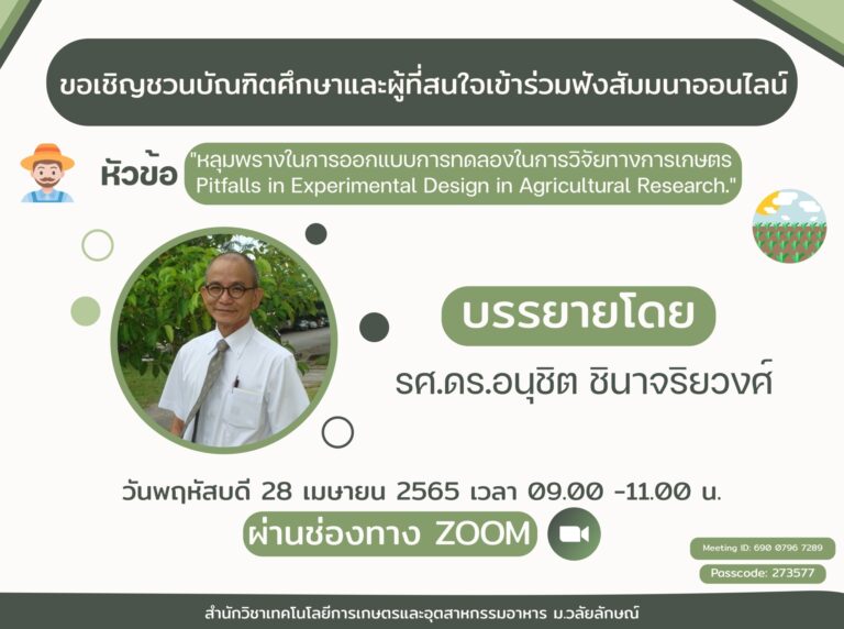 ขอเชิญบัณฑิตศึกษา นักวิจัย และผู้สนใจทั่วไปเข้าฟังการบรรยายในหัวข้อ “หลุมพรางในการออกแบบการทดลองในการวิจัยทางการเกษตร Pitfalls in Experimental Design in Agricultural Research.”