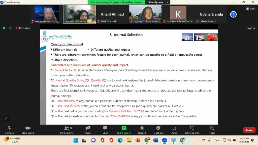 บรรยากาศการสัมมนาเข้มข้น: กลยุทธ์การเขียนบทความวิชาการสู่ความสำเร็จวันที่ 4 สิงหาคม 2568 สำนักวิชาเทคโนโลยีการเกษตรและอุตสาหกรรมอาหาร ได้จัดสัมมนาเชิงวิชาการในหัวข้อ“How to Prepare an Effective Manuscript: Practical Strategies for Academic Publishing Success”โดยได้รับเกียรติจาก ศาสตราจารย์ ดร.สรรพสิทธิ์ กล่อมเกล้า จากมหาวิทยาลัยทักษิณ มาถ่ายทอดความรู้และแบ่งปันกลยุทธ์สำคัญในการเขียนและการตีพิมพ์ผลงานวิชาการให้ประสบความสำเร็จผู้เข้าร่วมสัมมนาได้เรียนรู้ทั้ง เคล็ดลับ เทคนิค และแนวทางเชิงปฏิบัติ ที่สามารถนำไปปรับใช้ในการพัฒนางานเขียนของตนเอง เพื่อยกระดับคุณภาพงานวิจัยและเพิ่มโอกาสในการเผยแพร่สู่ระดับนานาชาติ นับเป็นอีกหนึ่งโอกาสอันทรงคุณค่าในการเสริมสร้างศักยภาพด้านการวิจัยและการสื่อสารทางวิชาการอย่างแท้จริง