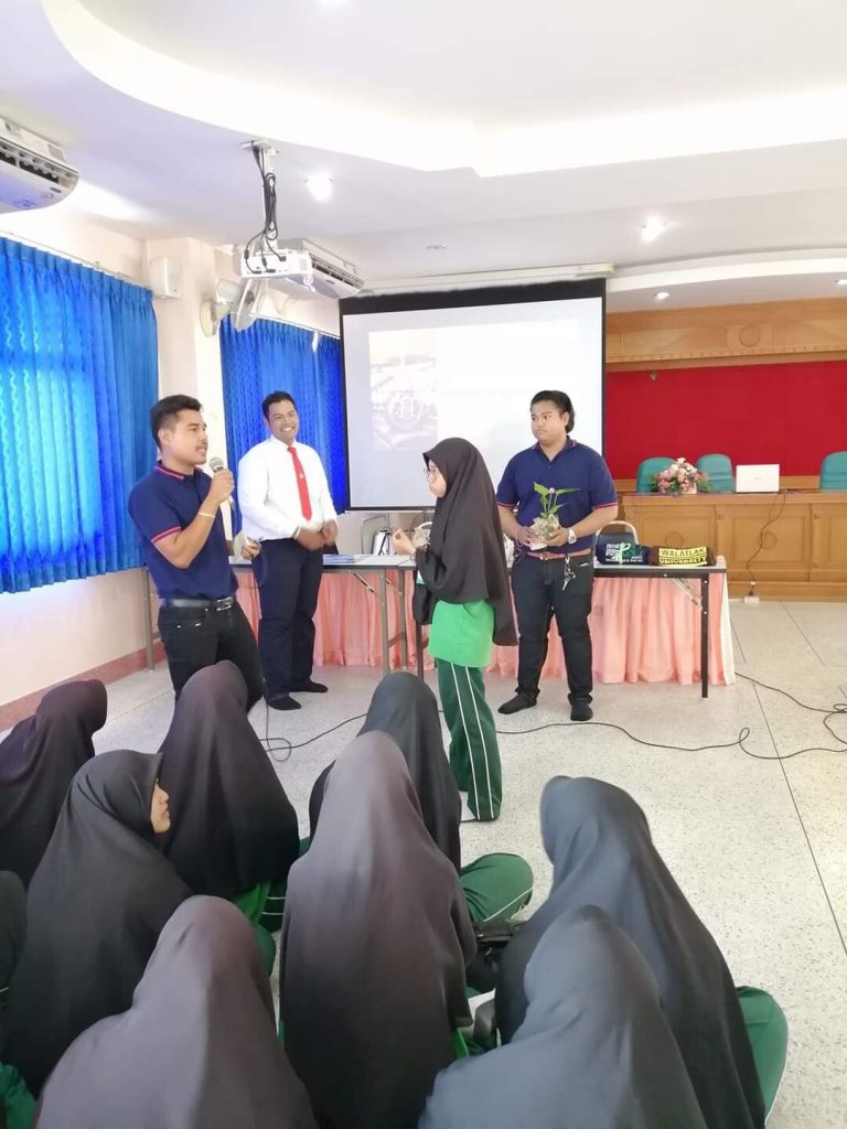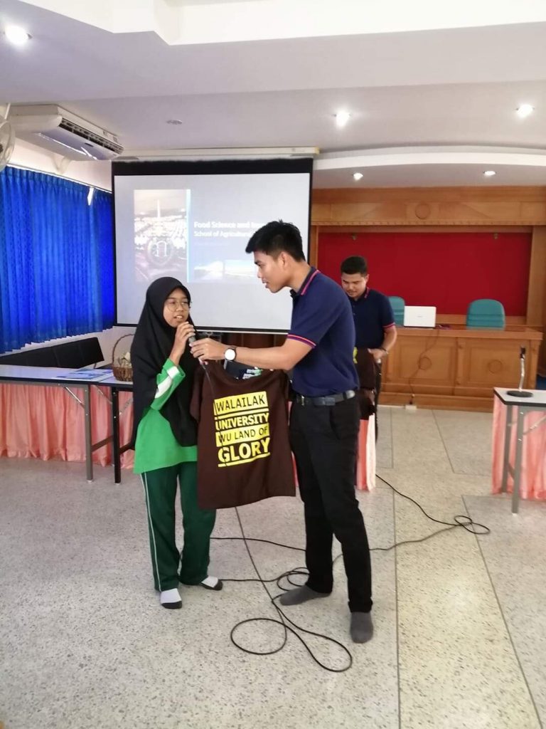 เมื่อวันที่ 23 สิงหาคม 2562 ทีมงานคณาจารย์ นักวิชาการ และนักศึกษา สำนักวิชาเทคโนโลยีการเกษตร มหาวิทยาลัยวลัยลักษณ์ นำโดย อาจารย์ ดร.อรรถกร พรมวี และอาจารย์ ดร. สุเมธี ส่งเสมอ ได้เข้าทำกิจกรรมประชาสัมพันธ์ หลักสูตรทั้ง 2 หลักสูตร ของสำนักวิชาฯ คือ หลักสูตรเกษตรศาสตร์และนวัตกรรม และหลักสูตรวิทยาศาสตร์อาหารและนวัตกรรม ที่โรงเรียนมุสลิมสันติธรรมมูลนิธิ โดยกิจกรรมครั้งนี้มีนักเรียนเข้าร่วมรับฟังกว่า 70 คน น้องๆ นักเรียนที่เข้าร่วมกิจกรรมมีความกระตือร้นอยากรู้เกี่ยวกับหลักสูตรและซักถามรายละเอียดเพิ่มเติมเป็นจำนวนมาก ซึ่งทางทีมงานได้ให้รายละเอียดกับนักเรียนอย่างเต็มที่เพื่อใช้เป็นข้อมูลในการเลือกศึกษาต่อในระดับอุดมศึกษา พร้อมทั้งได้ให้ข้อมูลเกี่ยวกับทุนการศึกษาต่างๆ ที่มหาวิทยาลัยพร้อมจัดสรรให้กับนักศึกษาที่มีศักยภาพอีกด้วย