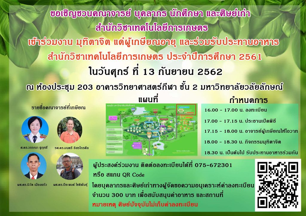 ขอเรียนเชิญบุคลากร ศิษย์เก่า และนักศึกษาปัจจุบันเข้าร่วมกิจกรรมมุทิตาจิต ระลึกถึงบุญคุณของคณาจารย์ ก่อนที่ท่านจะเกษียณในปีนี้ค่ะ ประกอบด้วย
