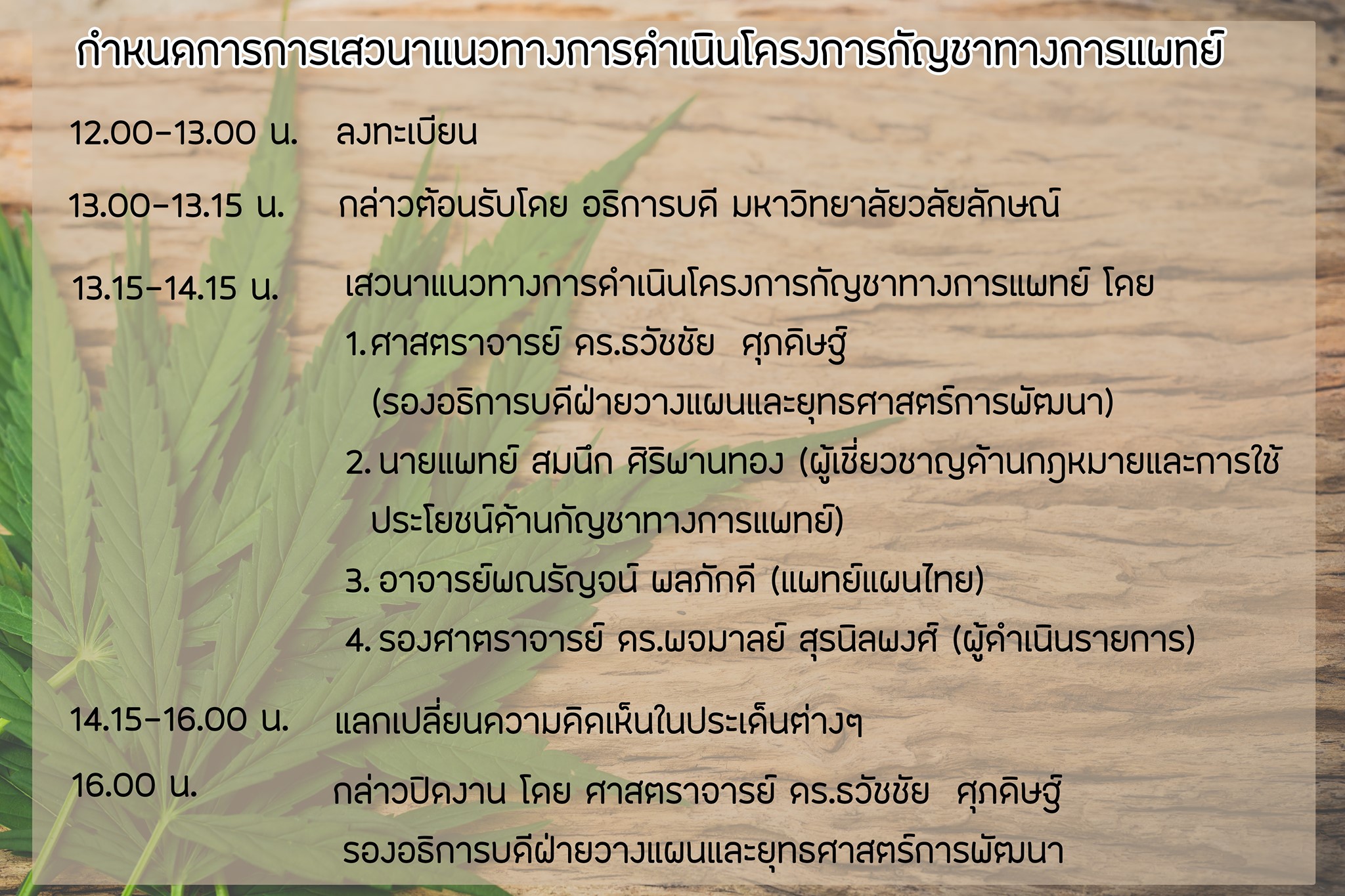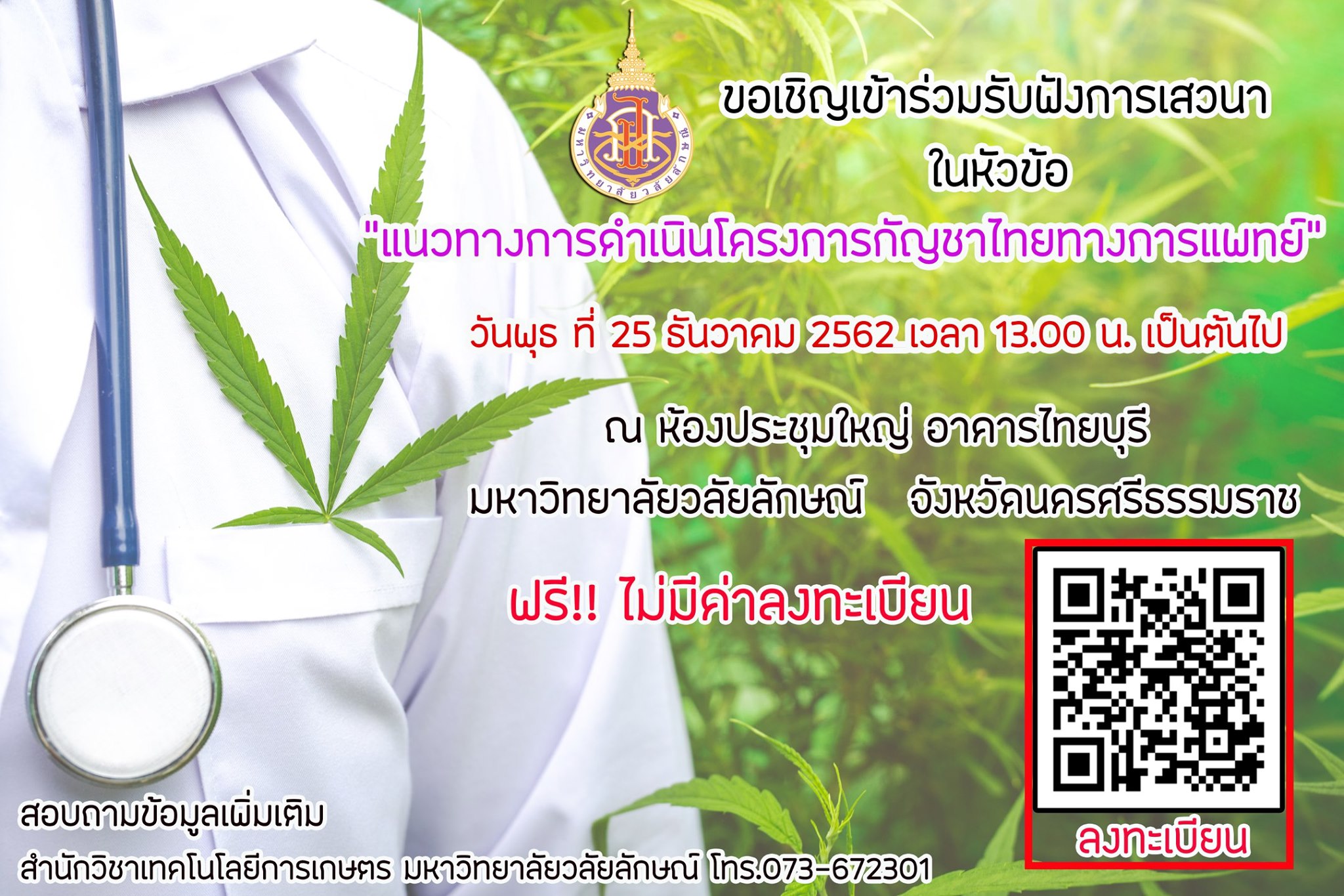 ขอเรียนเชิญผู้สนใจ เข้าร่วมรับฟังการเสวนาฟรี!!! ในหัวข้อ “แนวทางการดำเนินโครงการกัญชาไทยทางการแพทย์” วันที่ 25 ธ.ค.62 / ข่าวทั่วไป / By Khorseemah Mamang ขอเรียนเชิญผู้สนใจ เข้าร่วมรับฟังการเสวนาฟรี!!! ในหัวข้อ ☘️“แนวทางการดำเนินโครงการกัญชาไทยทางการแพทย์” 📌วันพุธที่ 25 ธันวาคม 2562 ⏰ เวลา 13.00 น. เป็นต้นไป 🏠ณ ห้องประชุมใหญ่ อาคารไทยบุรี มหาวิทยาลัยวลัยลักษณ์ จ.นครศรีธรรมราช แชร์เลย!!FacebookGoogleTwitterEmailPinterest