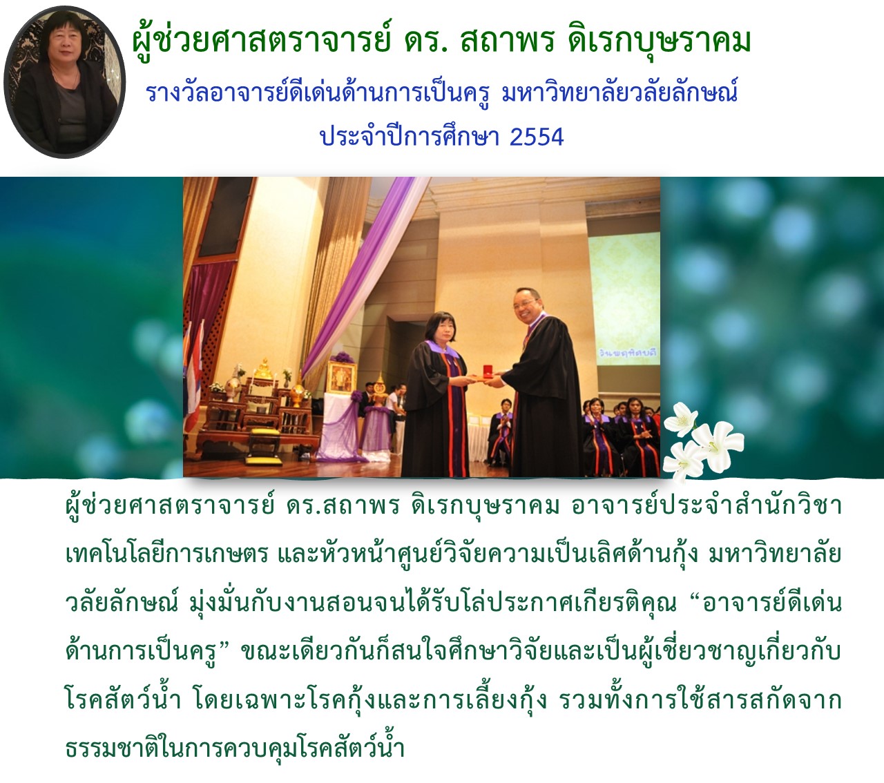 🌹บ้าน สทก…มุ่งสู่ปีที่ 28 ปีแห่งความรุ่งโรจน์.. หลักสูตรเกษตรศาสตร์และนวัตกรรม ภูมิใจกับ ผู้ช่วยศาสตราจารย์ ดร. สถาพร ดิเรกบุษราคม อาจารย์สาขาประมง กับรางวัลอาจารย์ดีเด่นด้านการเป็นครู มหาวิทยาลัยวลัยลักษณ์ ประจำปีการศึกษา 2554