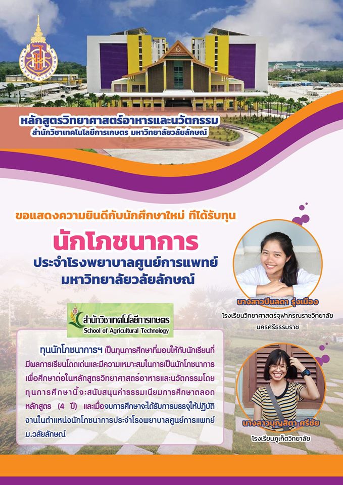 🌹การเติบโตในปี 2563 นี้ ทางหลักสูตรวิทยาศาสตร์อาหารและนวัตกรรมได้รับโควต้าในการผลิตบัณฑิตเพื่อบรรจุเป็นนักโภชนาการ ประจำโรงพยาบาลศูนย์การแพทย์ มหาวิทยาลัยวลัยลักษณ์ และทางหลักสูตรได้คัดเลือกผู้ที่สมควรได้รับทุนดังกล่าวเรียบร้อยแล้วจึงขอแสดงความยินดีมา ณ โอกาสนี้