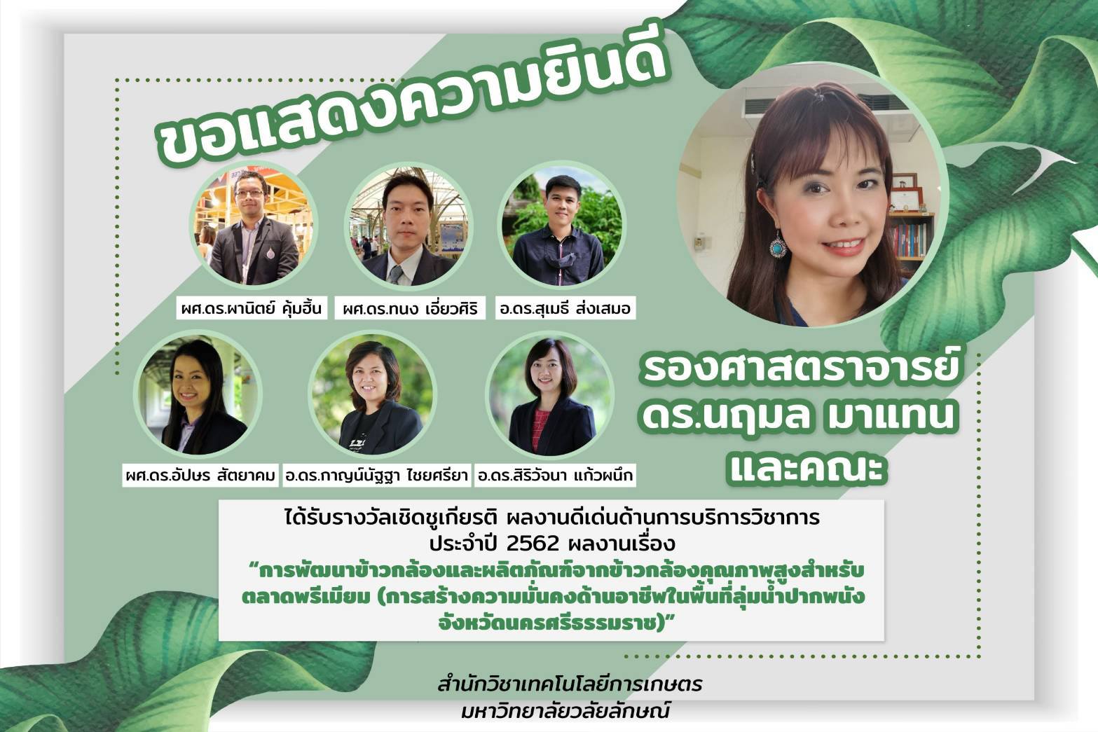 สำนักวิชาเทคโนโลยีการเกษตร โดยหลักสูตรวิทยาศาสตร์อาหารและนวัตกรรม ขอแสดงความยินดีกับนักวิจัยที่ได้นำผลงานวิจัยไปใช้ประโยชน์ในโครงการการพัฒนาข้าวกล้องและผลิตภัณฑ์จากข้าวกล้องคุณภาพสูงสำหรับตลาดพรีเมียม (การสร้างความมั่นคงด้านอาชีพในพื้นที่ลุ่มน้ำปากพนัง จังหวัดนครศรีธรรมราช) ที่ได้รับรางวัลผลงานดีเด่นด้านการบริการวิชาการประจำปี 2562